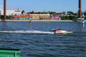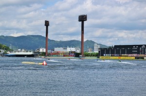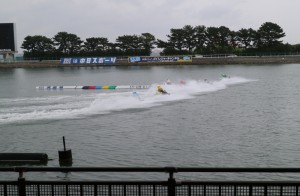 水面際です。芝生があっていい感じですねえ。スタンド1号館前で見ると野外スピーカーが無くて実況も聞こえないので、モーター音だけのレースが見れるそうです。って、なんか貴重な体験ですねえ。スタンド2号館の前にはスピーカーがあります。