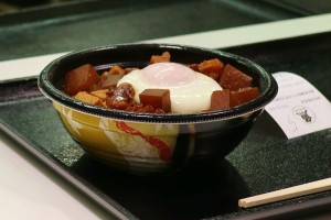蒲郡漁港食堂「三河産タコのどて丼温玉のせ(500円)味噌汁付き」