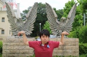 豊橋駅から市電で吉田城もある豊橋公園へ。豊橋市公会堂でこんせいそんさんは今日の運勢の飛翔を願ってポーズ。