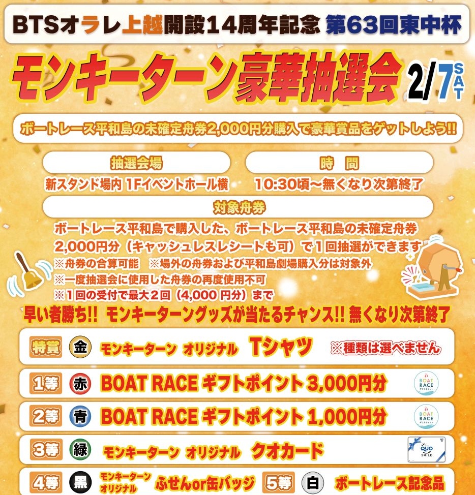 ボートレース平和島で購入したボートレース平和島の未確定舟券2,000円分(キャッシュレスレシートでも可)で1回抽選ができます