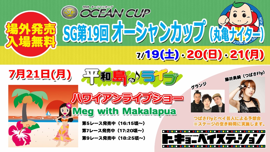 7月19・20・21日とSGオーシャンカップの本場場外発売を行います。開門は午後1時45分。ちょっとしたビアガーデン気分ですよお。発売箇所は本場スタンド1階・3階・ロイヤルです。