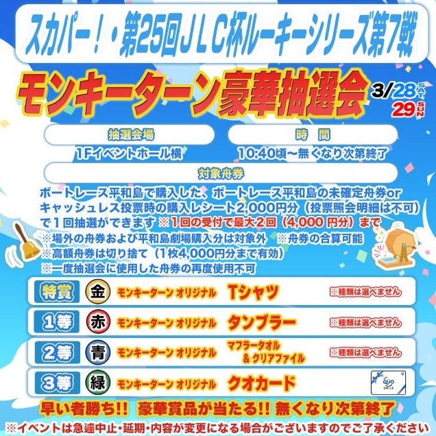 ボートレース平和島で購入したボートレース平和島の未確定舟券2,000円分(キャッシュレスレシートでも可)で1回抽選ができます