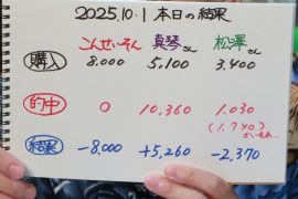 結局こんさん0勝、真琴さん1勝、松澤さん2勝(予想のみは1勝)。収支は真琴さん万舟ゲットで見事なプラスでした。おめでとうございます!