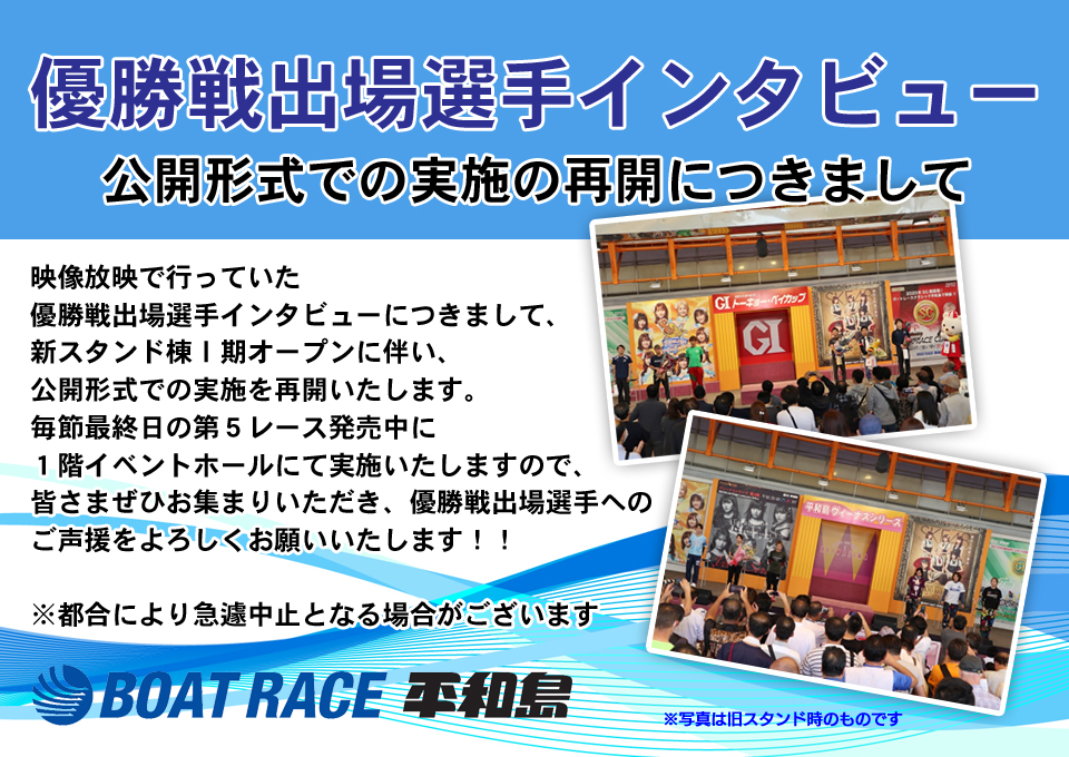 優勝戦出場選手インタビューの公開形式での実施の再開につきまして 投稿日:2025年12月24日 作成者: pstar ★優勝戦出場選手インタビューの公開形式での実施の再開につきまして 映像放映で行っていた優勝戦出場選手インタビューにつきまして、新スタンド棟Ⅰ期オープンに伴い、公開形式での実施を再開いたします。 毎節最終日の第5レース発売中に1階イベントホールにて実施いたしますので、皆さまぜひお集まりいただき、優勝戦出場選手へのご声援をよろしくお願いいたします!! ※都合により急遽中止となる場合がございます。