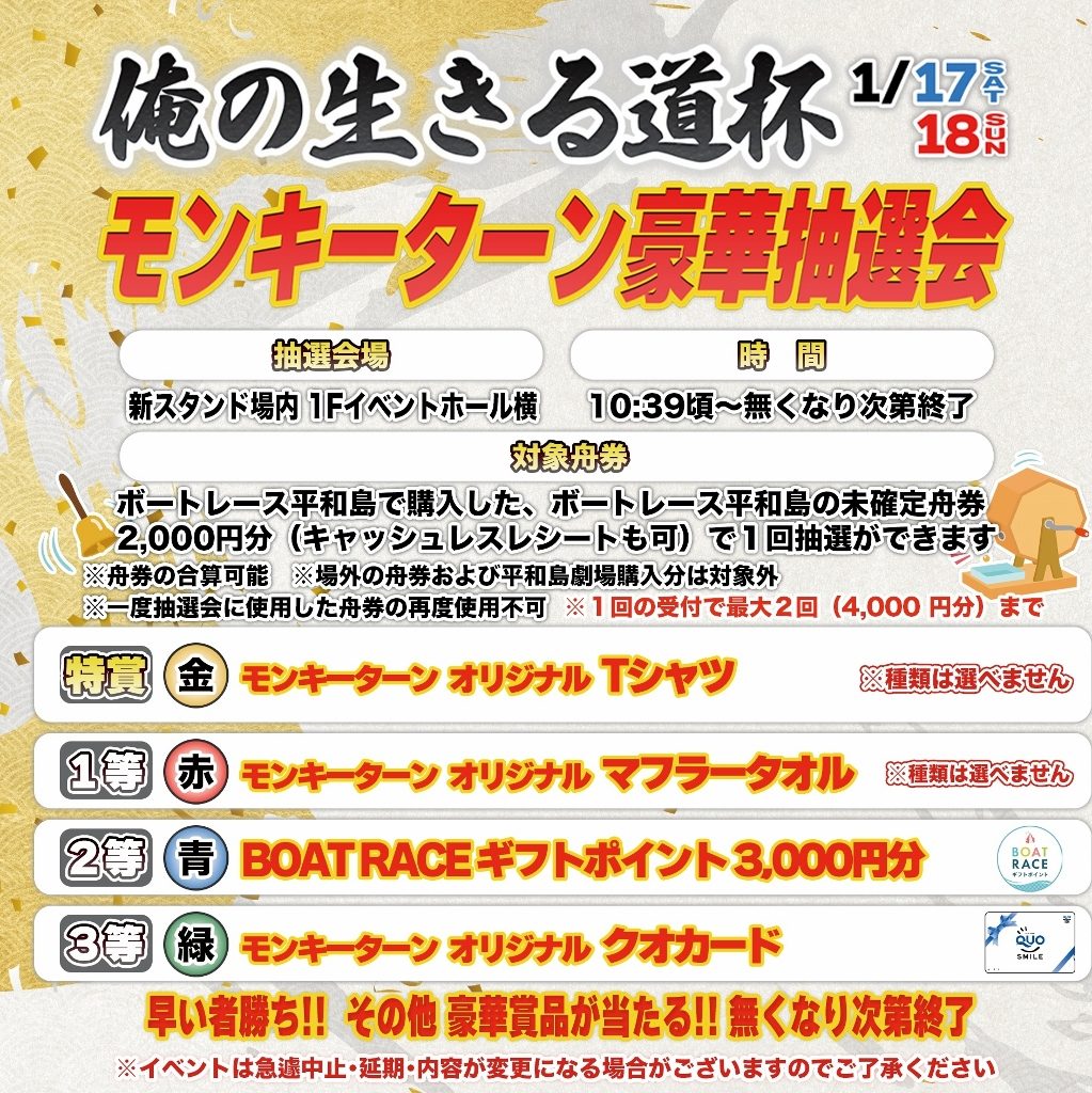 ボートレース平和島で購入したボートレース平和島の未確定舟券2,000円分(キャッシュレスレシートでも可)で1回抽選ができます