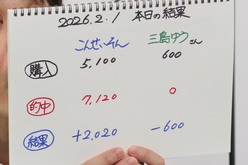 結局こんさん1勝、三島さんまさかの全敗。収支はこんさん1勝でも逃げ切りプラス収支でした。