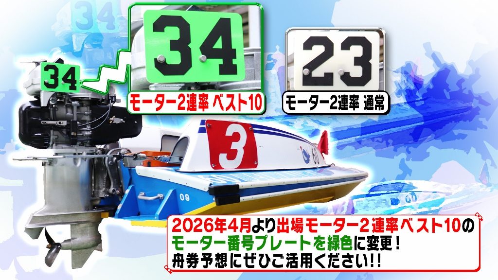 ★2連率ベスト10モーターの番号プレート装飾について 投稿日:2026年3月30日 作成者: pstar 2026年4月より出場モーター2連率ベスト10のモーター番号プレートを緑色に変更します! 舟券予想にぜひご活用ください!!
