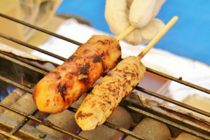 ぶたんぽは「きりたんぽ」の豚肉巻版。十和田湖高原ポーク 桃豚を「たんぽ」に巻いています。味付けは味噌味。結構ボリュームあります。